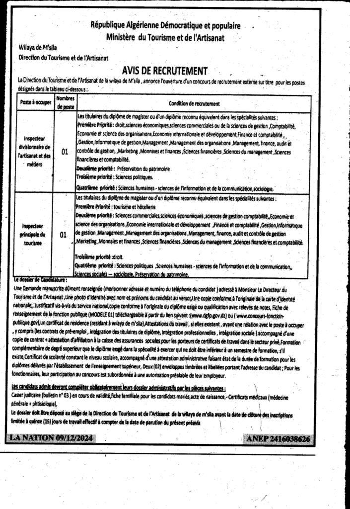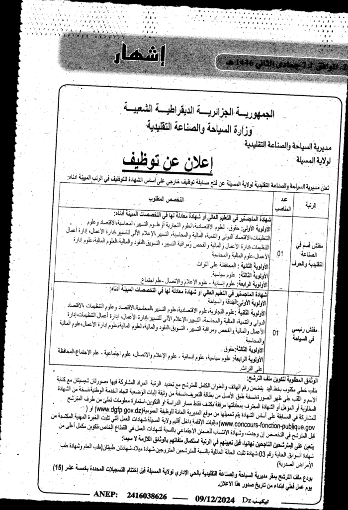إعلان عن توظيف مفتش قسم في الصناعة التقليدية والحرف ومفتش رئيسي في السياحة/ مديرية السياحة والصناعة التقليدية لولاية المسيلة