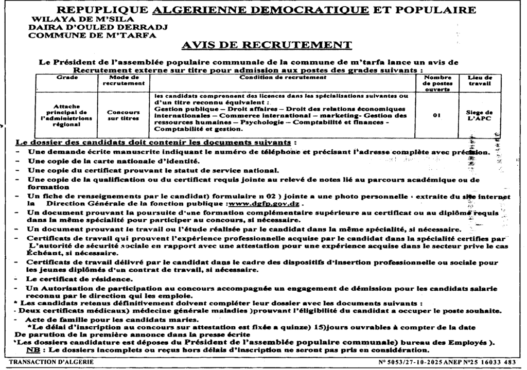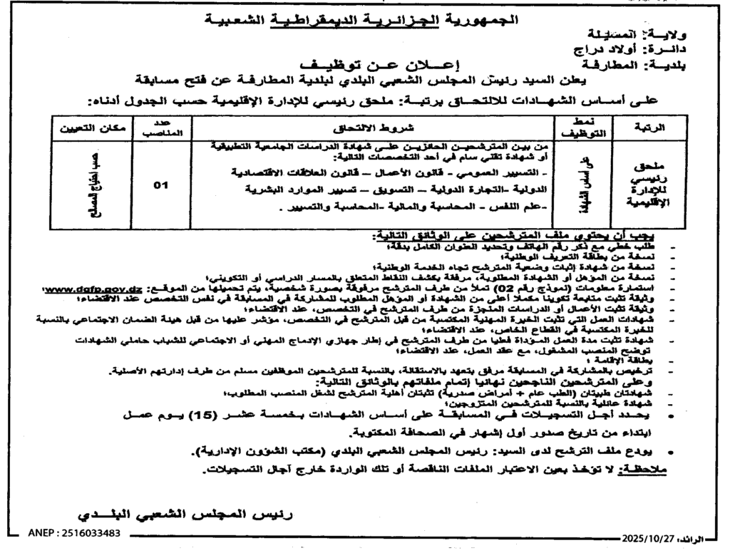 إعلان عن توظيف ملحق رئيسي للإدارة الاقليمية/ بلدية المطارفة