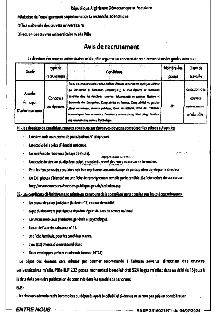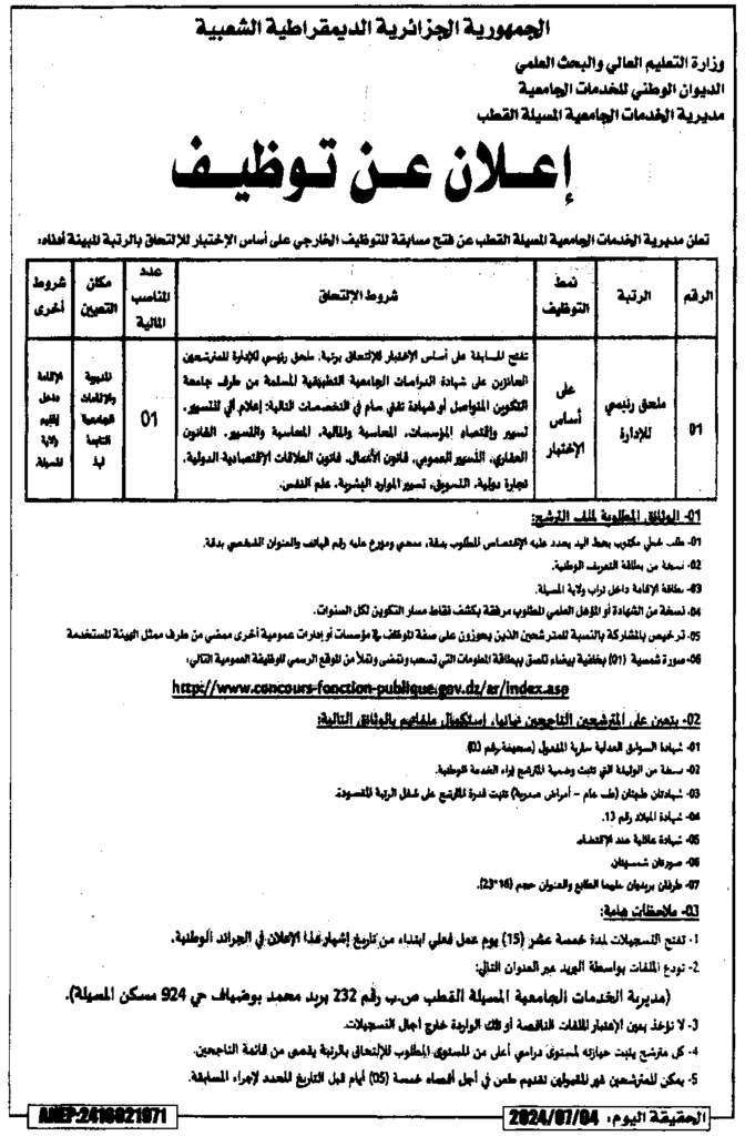 إعلان عن توظيف ملحق رئيسي للإدارة بمديرية الخدمات الجامعية بالمسيلة القطب