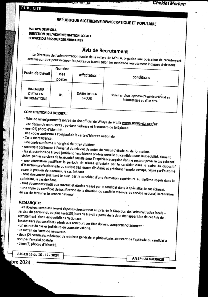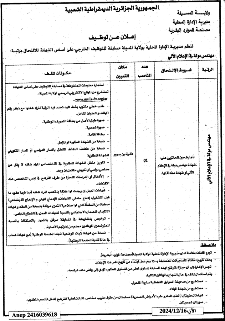 إعلان عن توظيف مهندس دولة في الإعلام الآلي/ مديرية الإدارة المحلية لولاية المسيلة