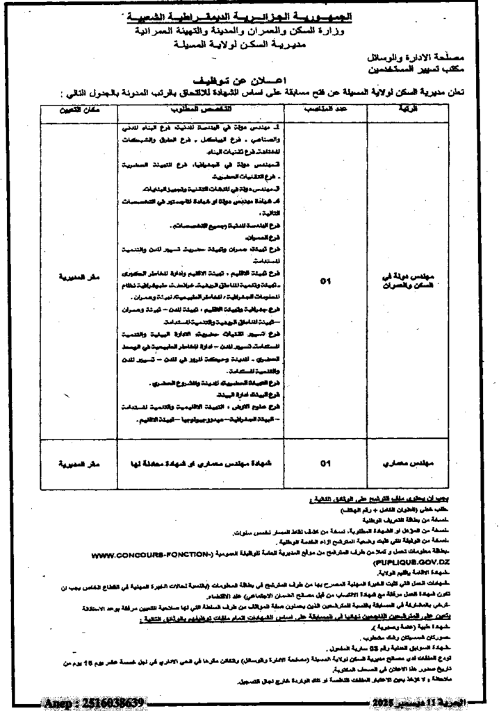 إعلان عن توظيف مهندس دولة في السكن والعمران/ مديرية السكن لولاية المسيلة