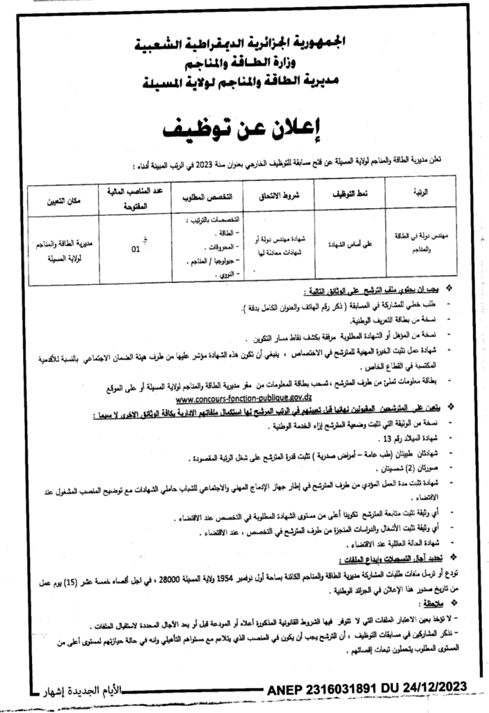 إعلان عن توظيف: مهندس دولة في الطاقة والمناجم/ مديرية الطاقة والمناجم لولاية المسيلة