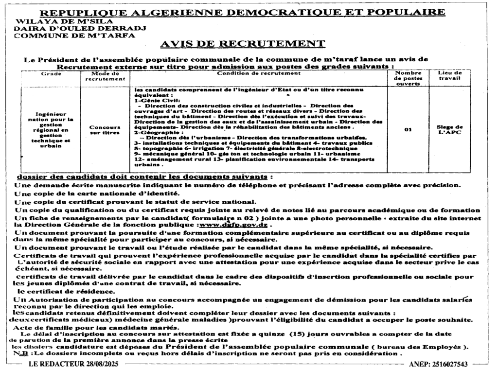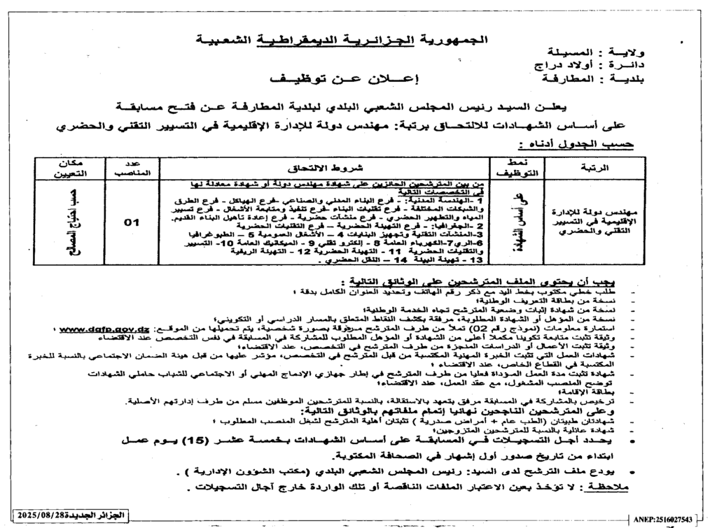 إعلان عن توظيف مهندس دولة للإدارة الإقليمية في التسيير التقني والحضري/ بلدية المطارفة