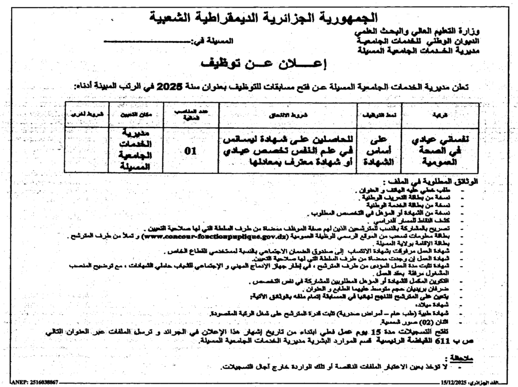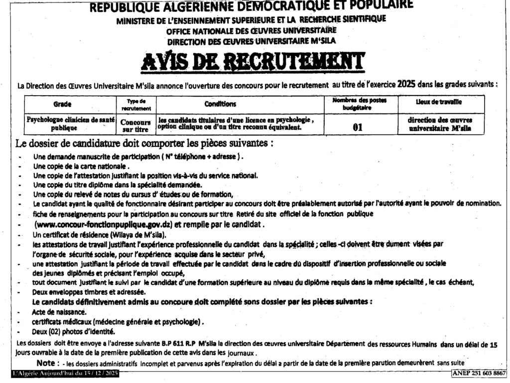 إعلان عن توظيف نفساني عيادي في الصحة العمومية/ مديرية الخدمات الجامعية المسيلة