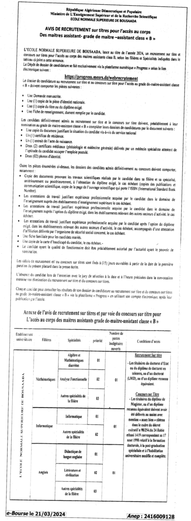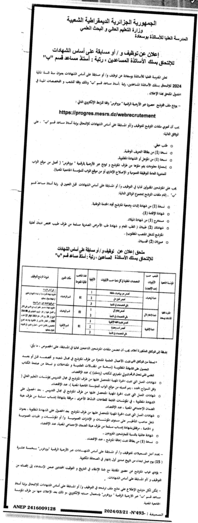 إعلان عن توظيف و/أو مسابقة على أساس الشهادات للإلتحاق بسلك الأساتذة المساعدين، رتبة أستاذ مساعد قسم “ب”/ المدرسة العليا للأساتذة بوسعادة