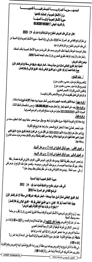 إعلان عن ثاني طلب العروض المفتوح 2023/29 مديرية الأشغال العمومية لولاية المسيلة