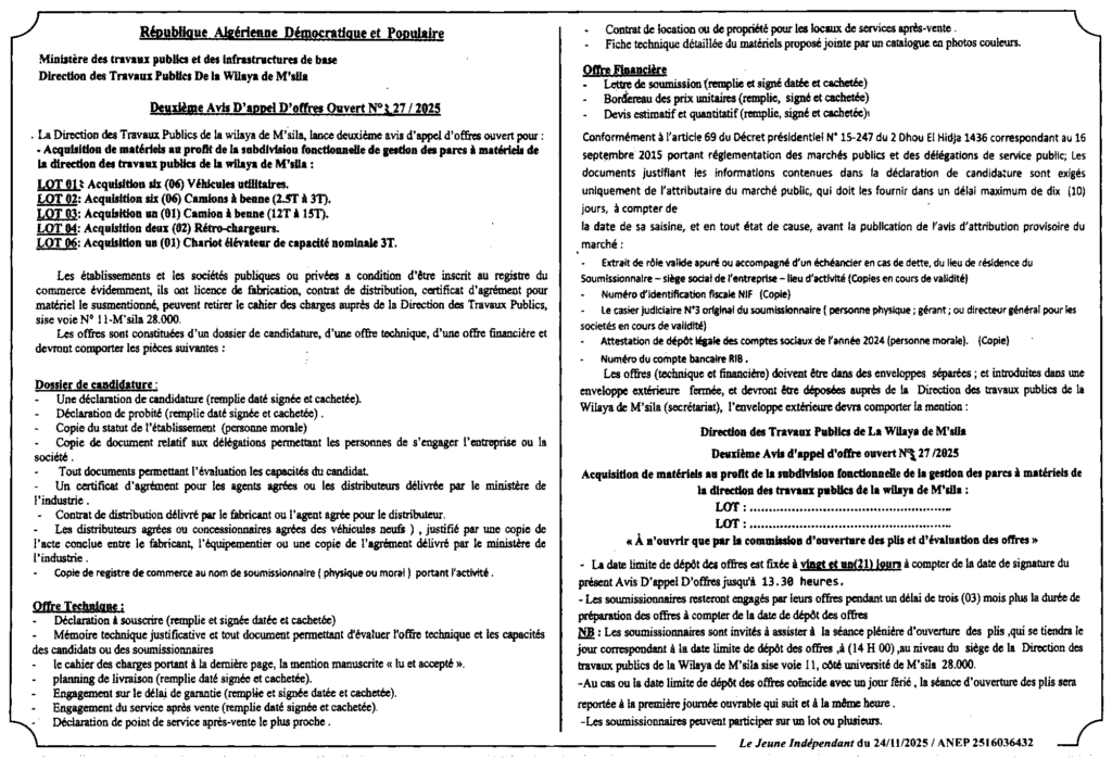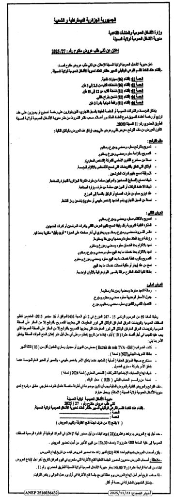 إعلان عن ثاني طلب عروض مفتوح 2025/27 مديرية الأشغال العمومية لولاية المسيلة