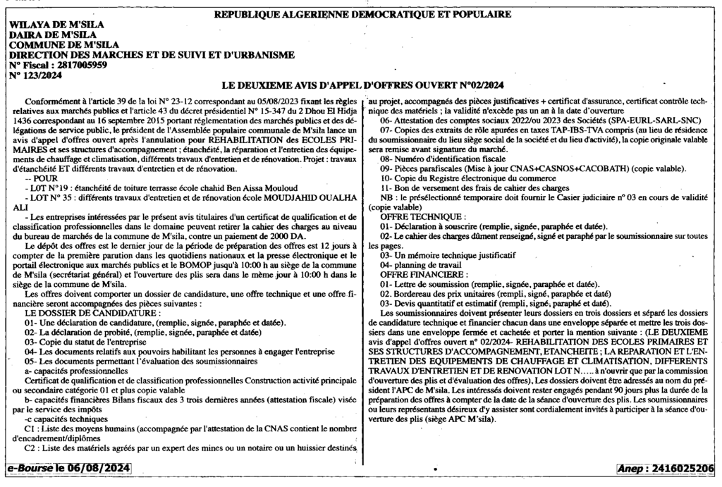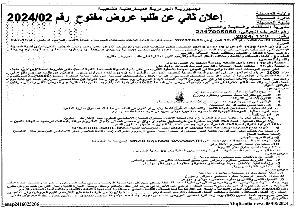 إعلان عن ثاني عن طلب عروض مفتوح 2024/02 بلدية المسيلة