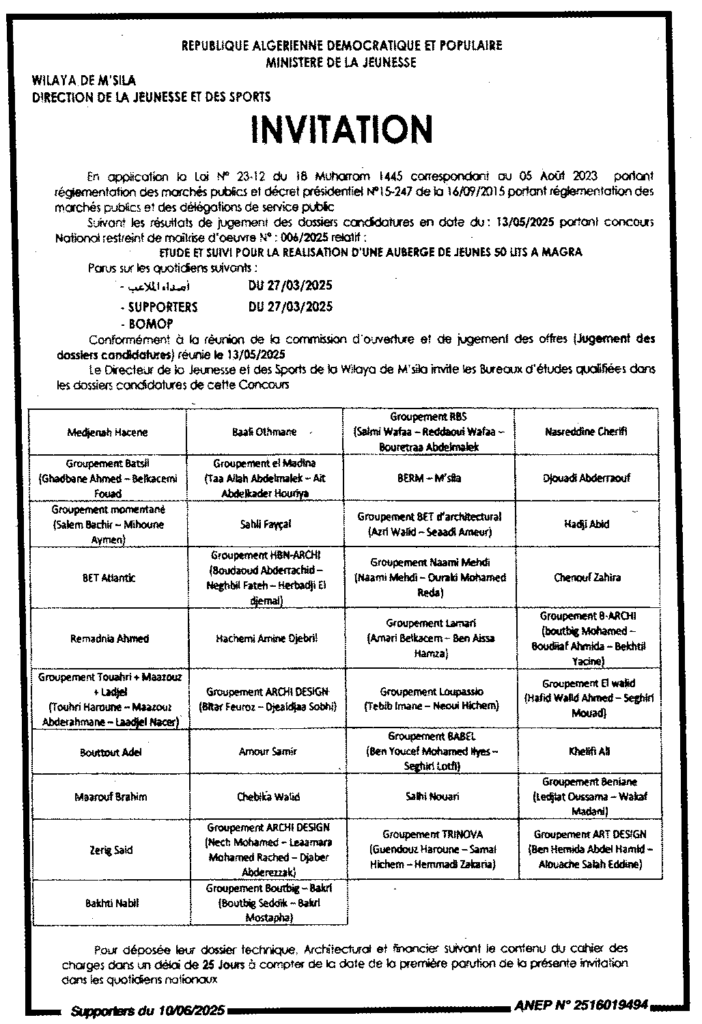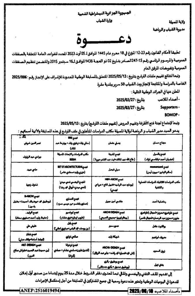 إعلان عن دعوة المتعلقة بدراسة انجاز بيت الشباب 50 سرير ببلدية مقرة/ مديرية الشباب والرياضة لولاية المسيلة