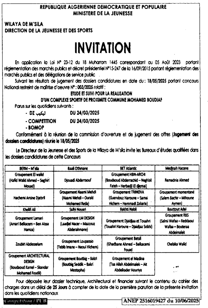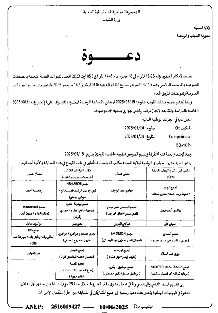 إعلان عن دعوة المتعلقة بدراسة انجاز مركب رياضي جواري ببلدية محمد بوضياف/ مديرية الشباب والرياضة لولاية المسيلة