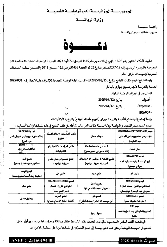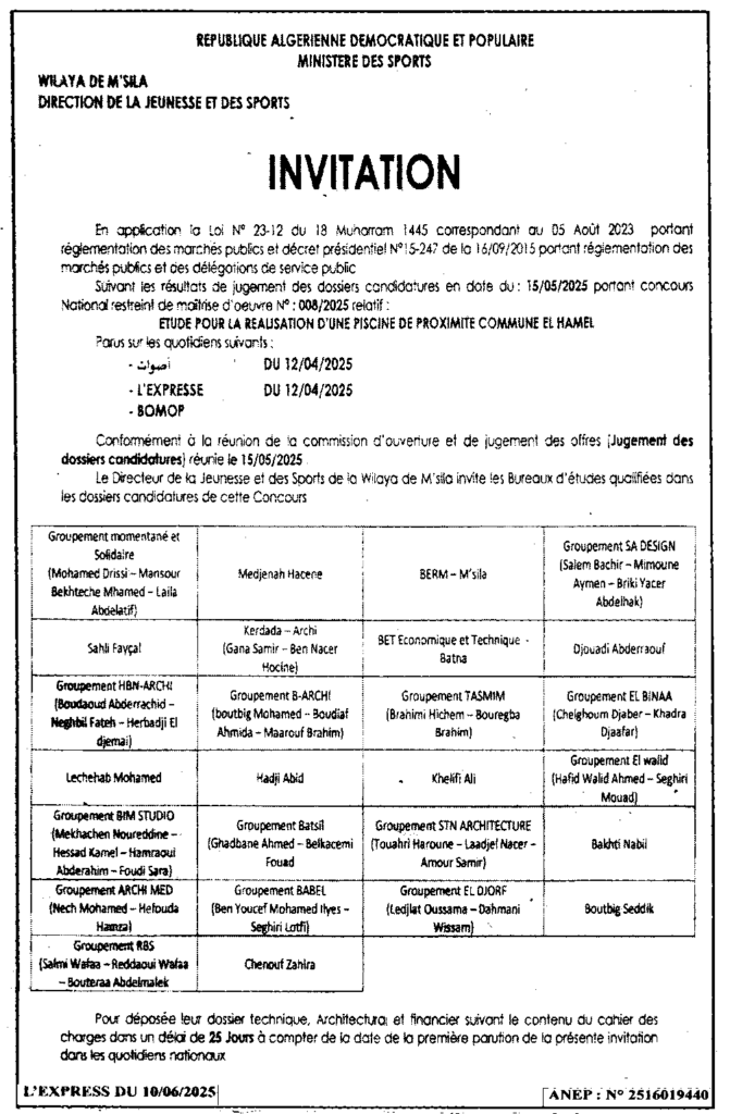 إعلان عن دعوة المتعلقة بدراسة انجاز مسبح جواري الهامل/ مديرية الشباب والرياضة لولاية المسيلة
