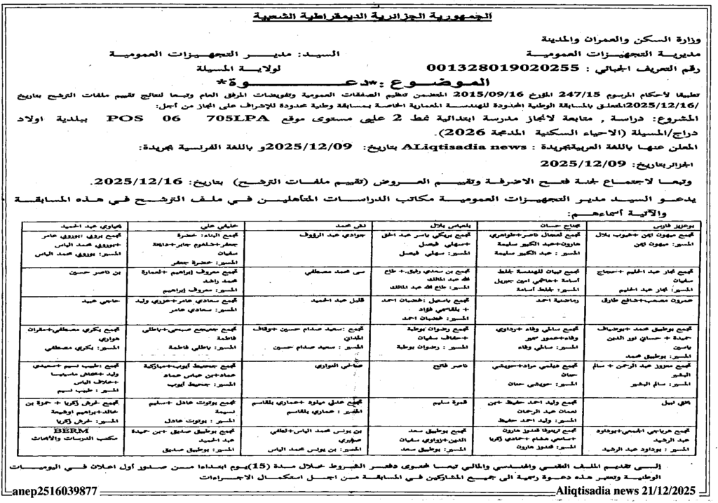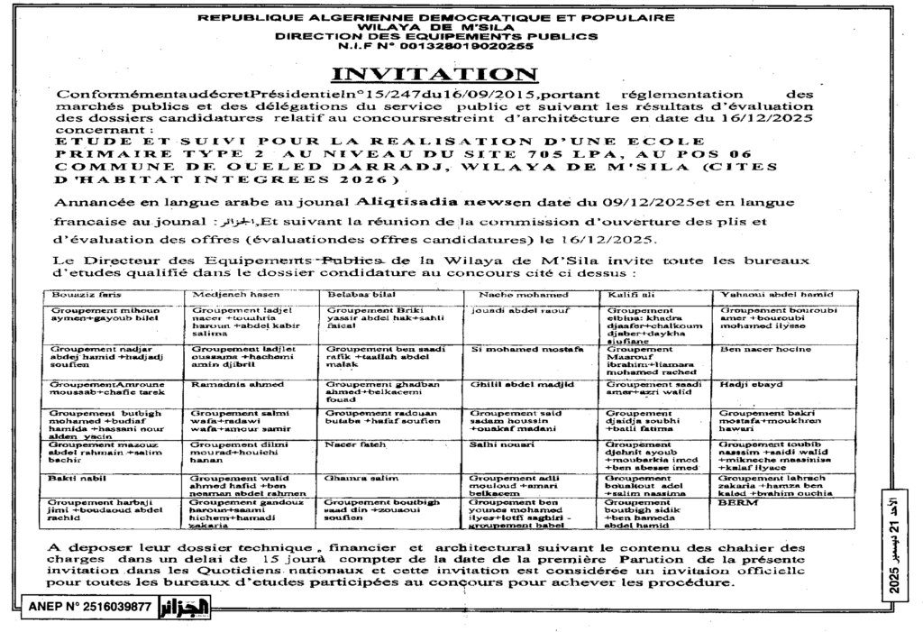 إعلان عن دعوة دراسة متابعة لانجاز مدرسة ابتدائية نمط 2 ببلدية أولاد دراج/ مديرية التجهيزات العمومية لولاية المسيلة