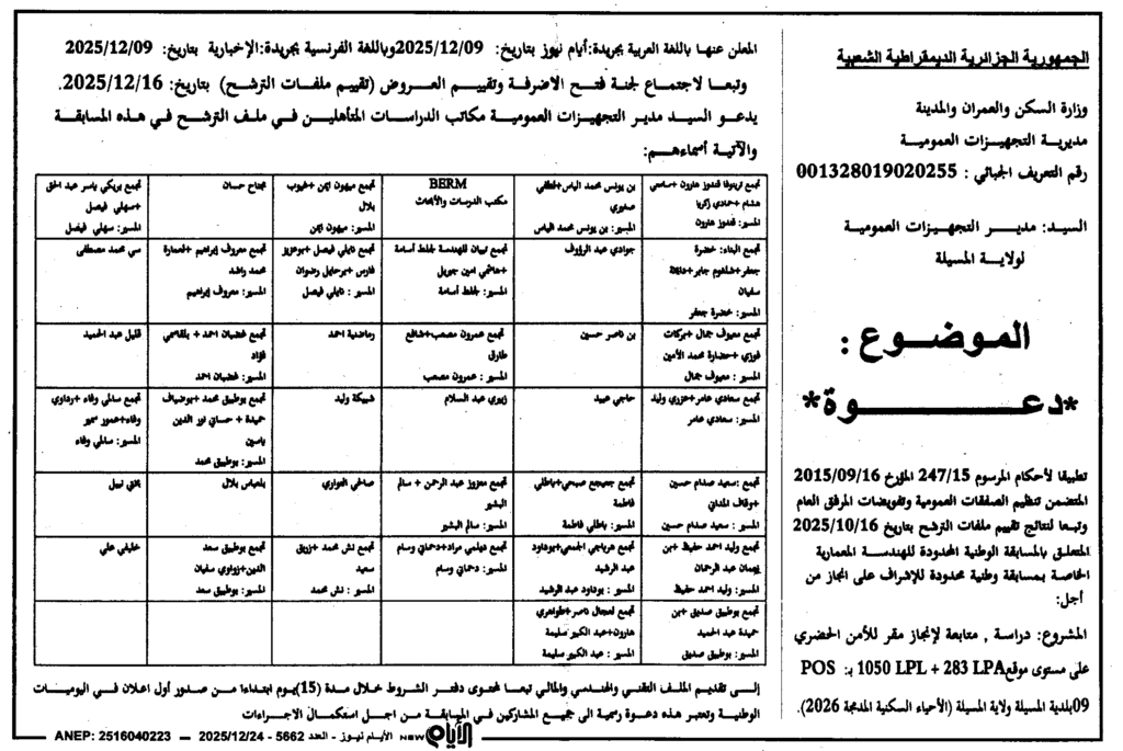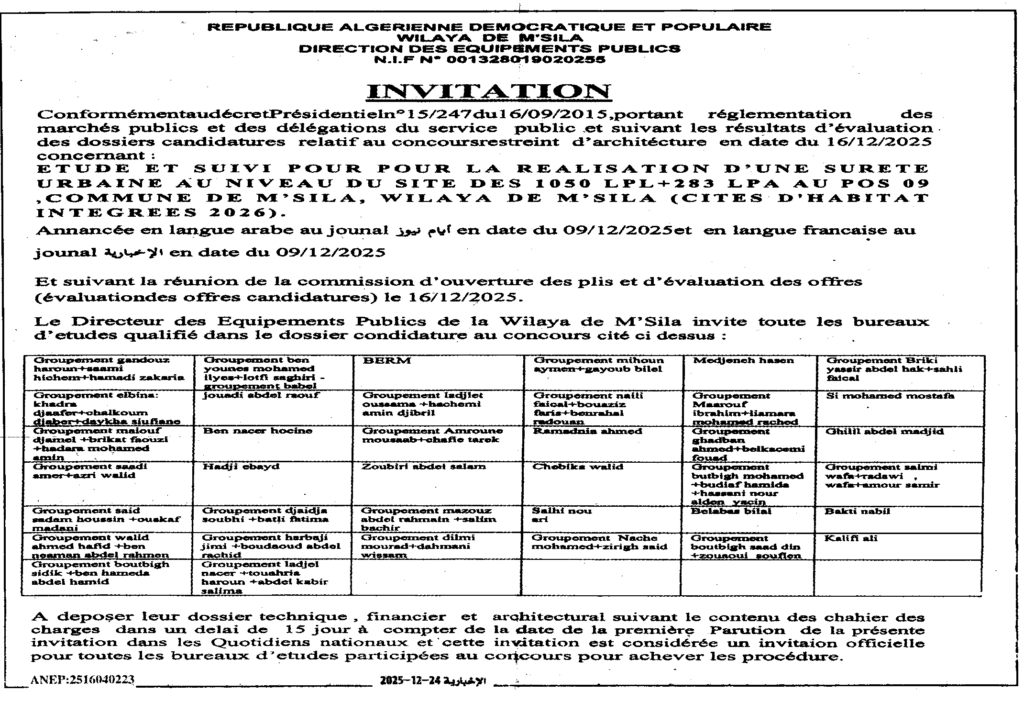 إعلان عن دعوة دراسة متابعة لانجاز مقر للأمن الحضري بلدية المسيلة/ مديرية التجهيزات العمومية لولاية المسيلة