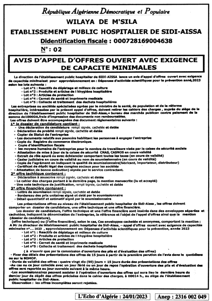 إعلان عن طلب العروض المفتوح قصد تموين المؤسسة العمومية الاستشفائية سيدي عيسى بمواد لنفقات النشاطات العلمية للوقاية لسنة 2023