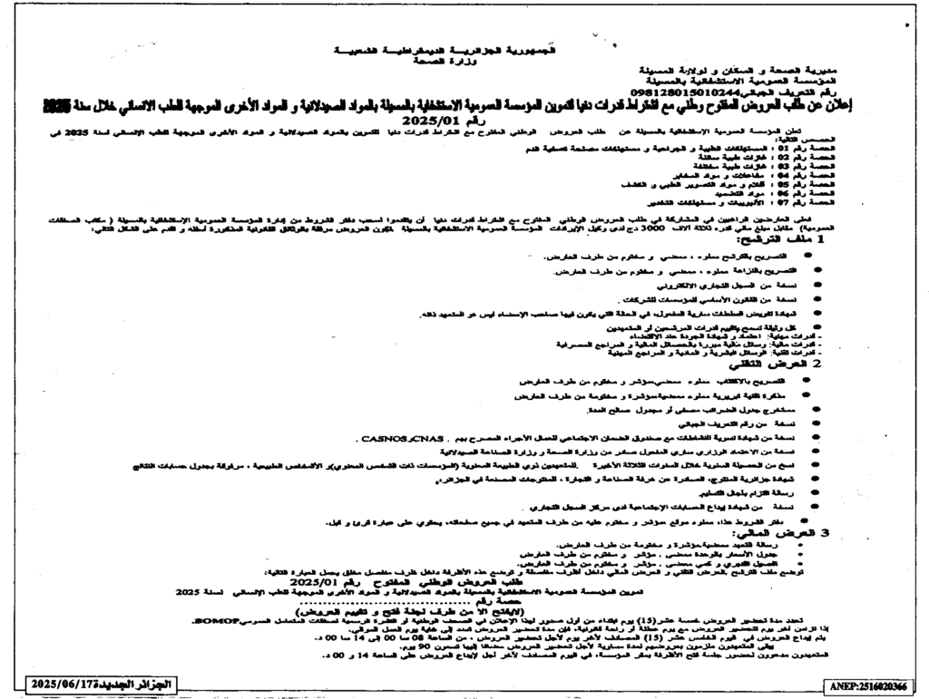 إعلان عن طلب العروض المفتوح وطني 2025/01 لتموين المؤسسة العمومية الاستشفائية بالمسيلة بالمواد الصيدلانية والمواد الأخرى الموجهة إلى الطب الانساني خلال سنة 2025
