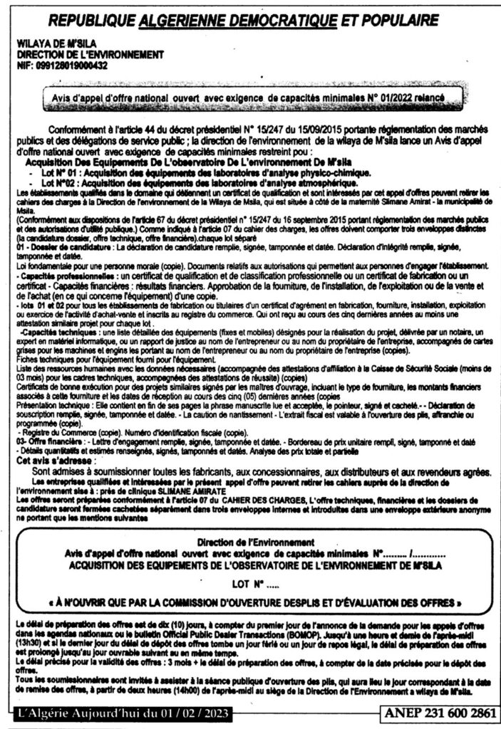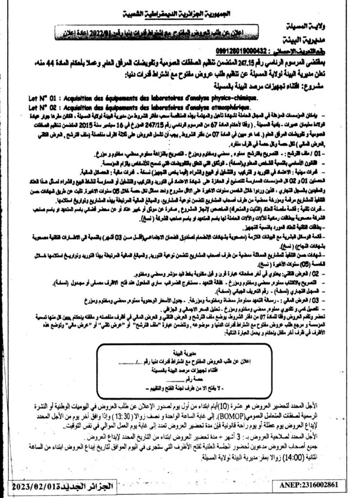 طلب عروض مفتوح مع اشتراط قدرات دنيا: مشروع اقتناء تجهيزات مرصد البيئة بالمسيلة1 فبراير، 20230 16 شاركها فيسبوك X مشاركة عبر البريد طباعة