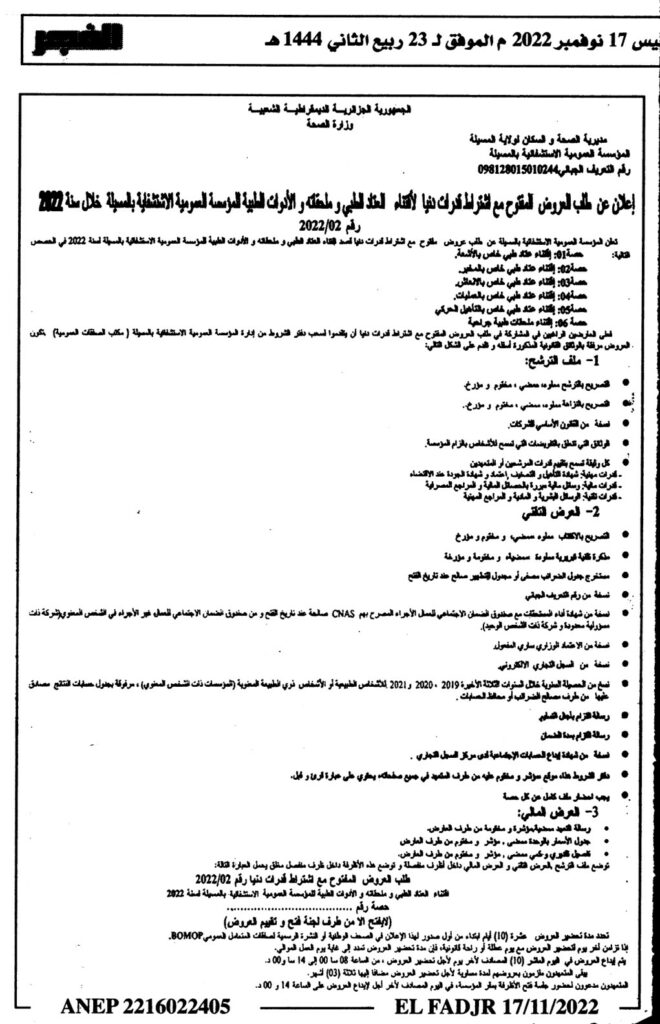 إعلان عن طلب العروض المفتوح 2022/02 لإقتناء العتاد الطبي وملحقاته والأدوات الطبية للمؤسسة العمومية الاستشفائية بالمسيلة خلال سنة 2022