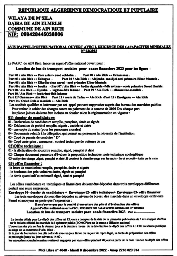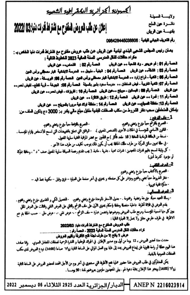 طلب عروض مفتوح مع اشتراط قدرات دنيا الخاصة بـ: كراء حافلات للنقل المدرسي للسنة المالية 20236 ديسمبر، 20220 10 شاركها فيسبوك X مشاركة عبر البريد طباعة