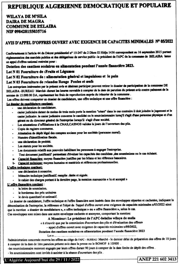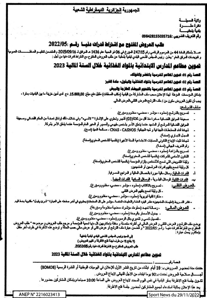 طلب العروض المفتوح مع اشتراط قدرات دنيا من أجل: تموين مطاعم المدارس الابتدائية بالمواد الغذائية خلال السنة المالية 202329 نوفمبر، 20220 30 شاركها فيسبوك X مشاركة عبر البريد طباعة
