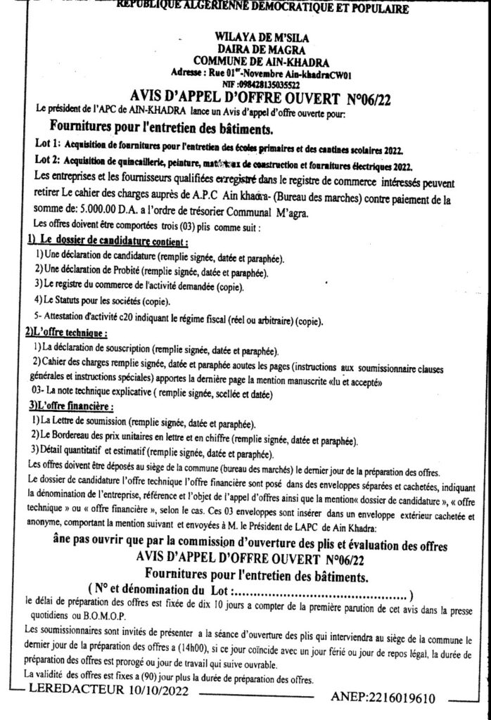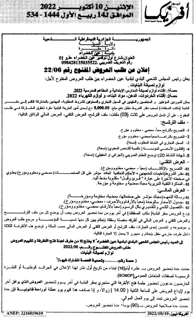 طلب العروض المفتوح لأجل: لوازم لصيانة البناياتحصة 1: لقتناء لوازم لصيانة المدارس الإبتدائية والمطاعم المدرسية 2022حصة 2: اقتناء الخردوات، الدهن، مواد البناء، ولوازم الكهرباء 202210 أكتوبر، 20220 21 شاركها فيسبوك X مشاركة عبر البريد طباعة