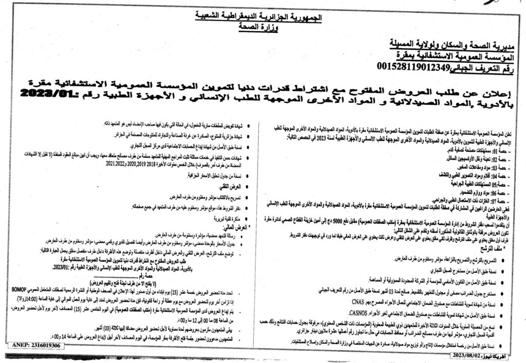 إعلان عن طلب العروض المفتوح 2023/01 لتموين المؤسسة العمومية الاستشفائية مقرة بالأدوية المواد الصيدلانية والمواد الأخرى الموجهة للطب الإنساني والأجهزة الطبية
