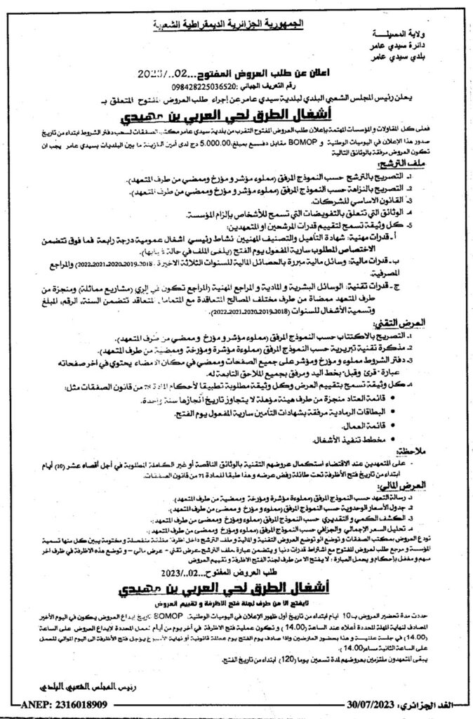 طلب العروض المفتوح المتعلق بـ : أشغال الطرق لحي العربي بن مهيدي30 يوليو، 20230 25 شاركها فيسبوك X مشاركة عبر البريد طباعة
