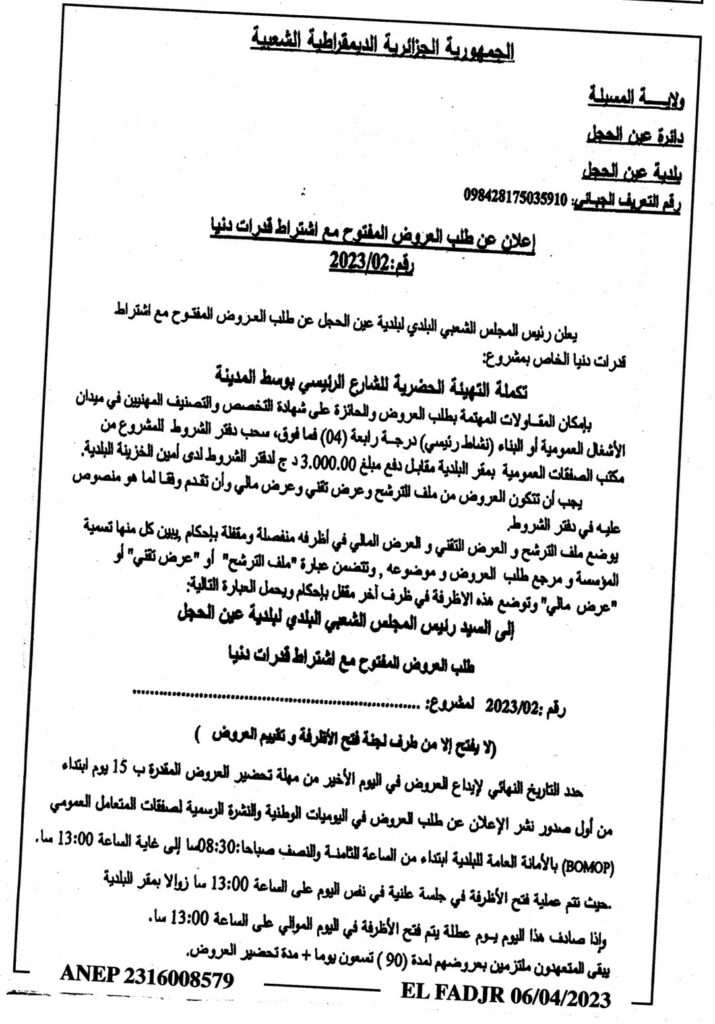 إعلان عن طلب العروض المفتوح 2023/02 بلدية عين الحجل