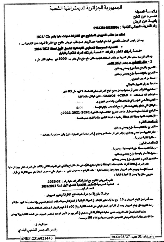 طلب عروض مفتوح مع اشتراط قدرات دنيا الخاصة بـ : التغذية المدرسية الابتدائية الفصل الاول لسنة 2024/202328 أغسطس، 20230 25 شاركها فيسبوك X مشاركة عبر البريد طباعة