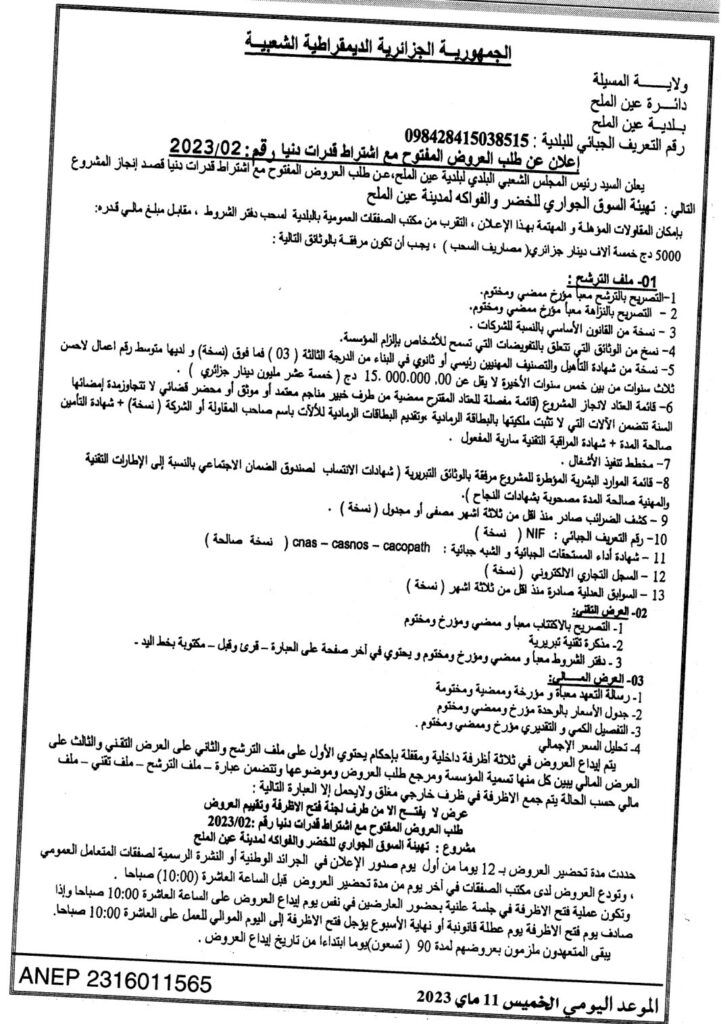 إعلان عن طلب العروض المفتوح 2023/02 تهيئة السوق الجواري للخضر والفواكه لمدينة عين الملح