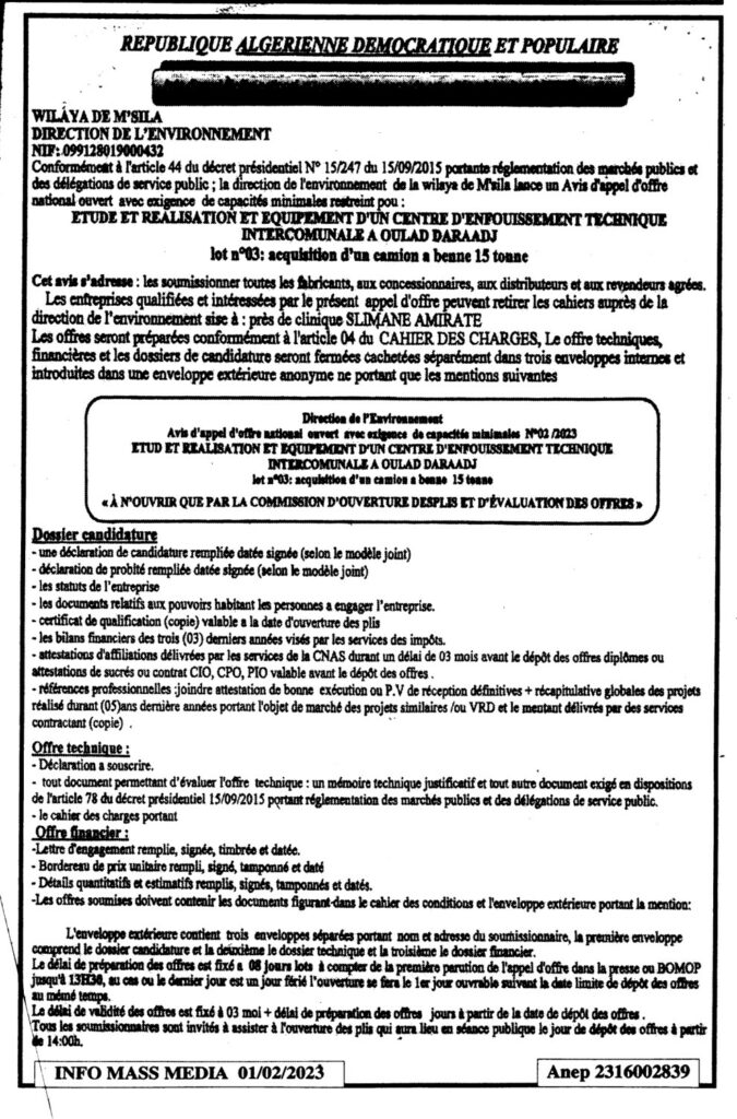 طلب عروض مفتوح مع اشتراط قدرات دنيا لمشروع: دراسة وإنجاز وتجهيز مركز الردم التقني ما بين البلديات بأولاد دراج1 فبراير، 20230 11 شاركها فيسبوك X مشاركة عبر البريد طباعة