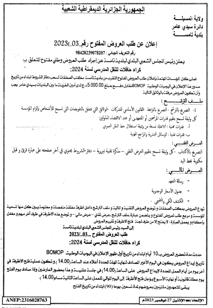 طلب عروض وطني مفتوح المتعلق بـ : كراء حافلات للنقل المدرسي لسنة 202427 نوفمبر، 20230 9 شاركها فيسبوك X مشاركة عبر البريد طباعة