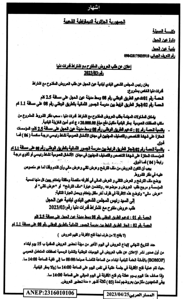 إعلان عن طلب العروض المفتوح 2023/03 بلدية عين الحجل