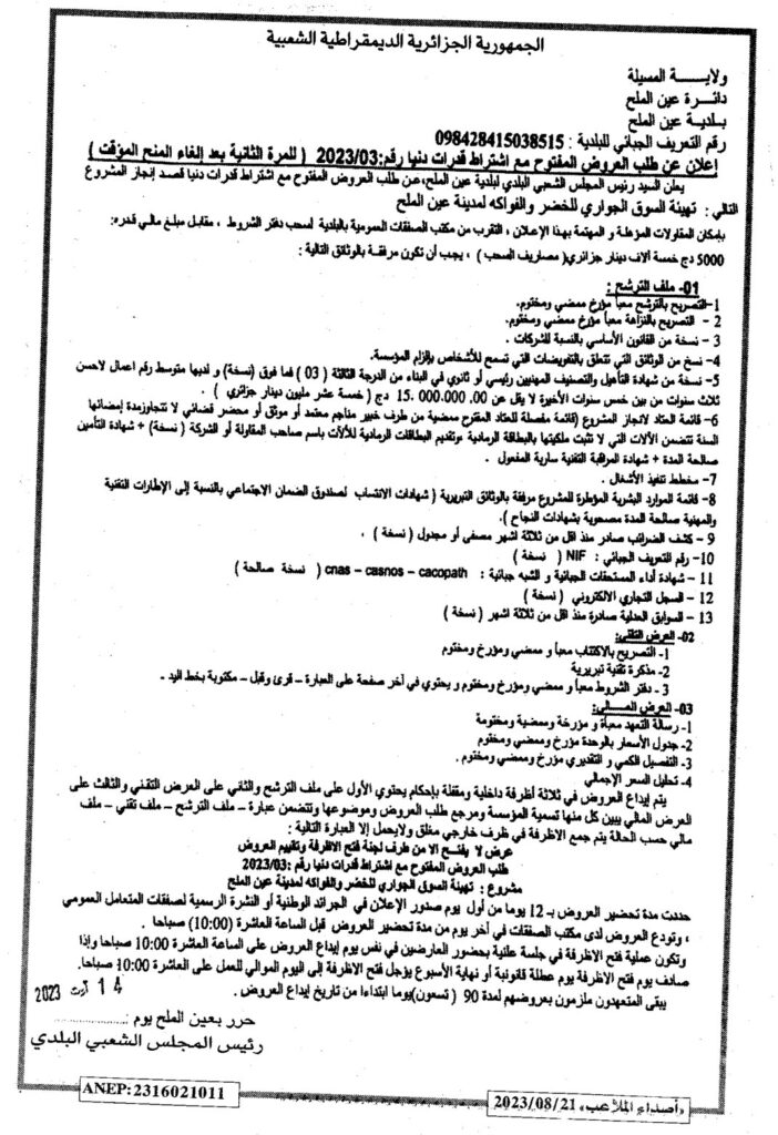طلب عروض مفتوح مع اشتراط قدرات دنيا قصدانجاز المشروع التالي: تهيئة السوق الجواري للخضر والفواكه21 أغسطس، 20230 3 شاركها فيسبوك X مشاركة عبر البريد طباعة