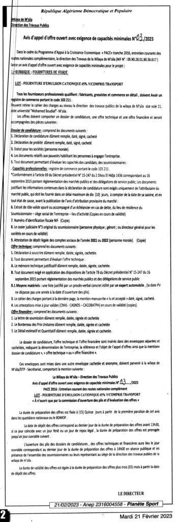 إعلان عن طلب العروض المفتوح 2023/03 مديرية الأشغال العمومية لولاية المسيلة