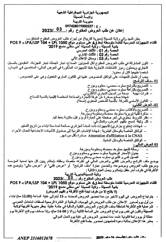 إعلان عن طلب العروض المفتوح 2023/03 مديرية التربية لولاية المسيلة