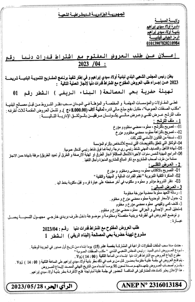 إعلان عن طلب العروض المفتوح 2023/04 بلدية أولاد سيدي ابراهيم