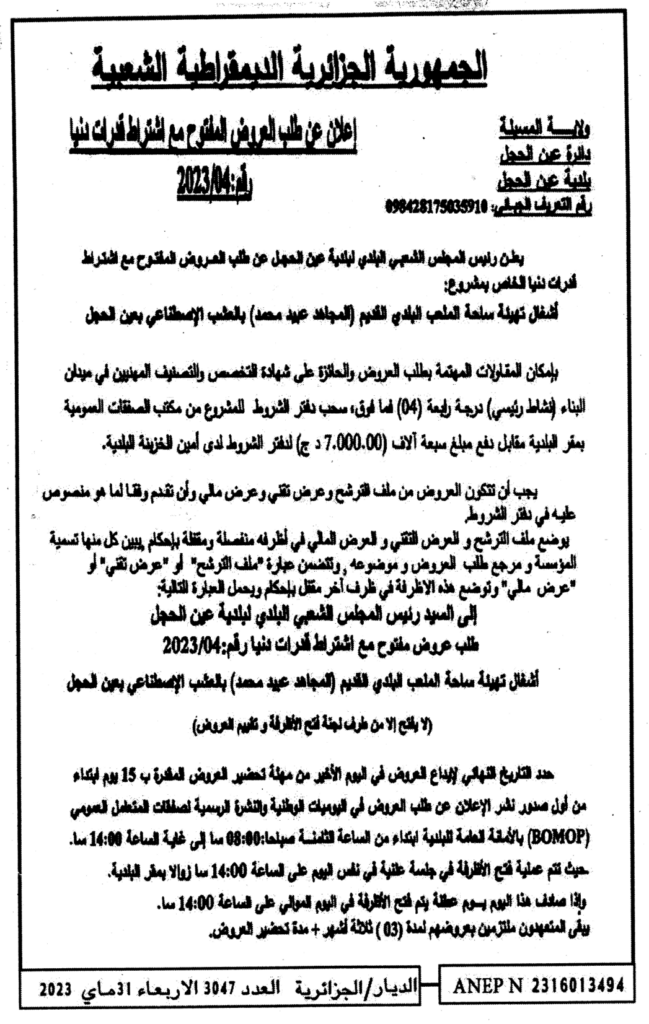 إعلان عن طلب العروض المفتوح 2023/04 بلدية عين الحجل