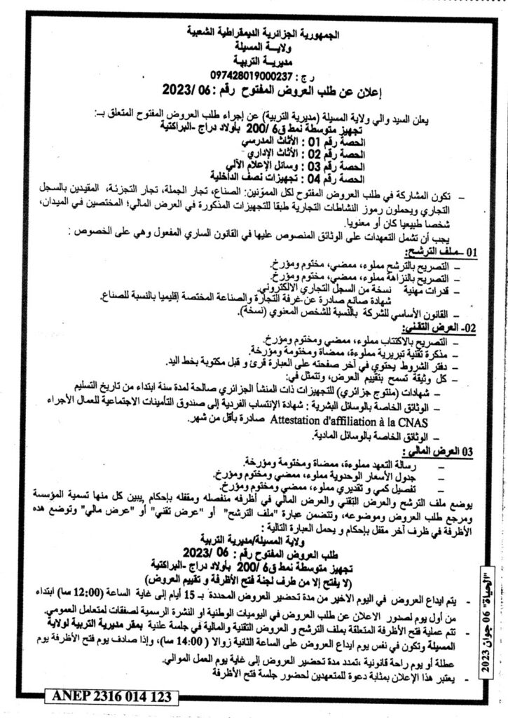 إعلان عن طلب العروض المفتوح 2023/06: تجهيز متوسطة نمط ق 200/6 بأولاد دراج-البراكتية/ مديرية التربية لولاية المسيلة