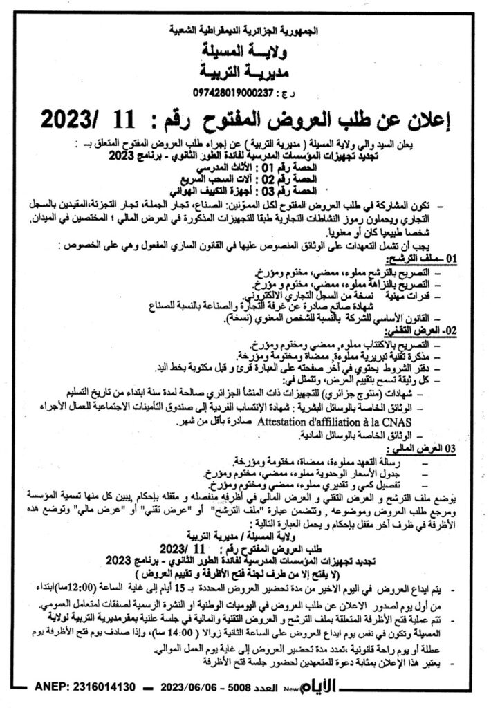 إعلان عن طلب العروض المفتوح 2023/11: تجديد تجهيزات المؤسسات المدرسية لفائدة الطور الثانوي – برنامج 2023/ مديرية التربية لولاية المسيلة