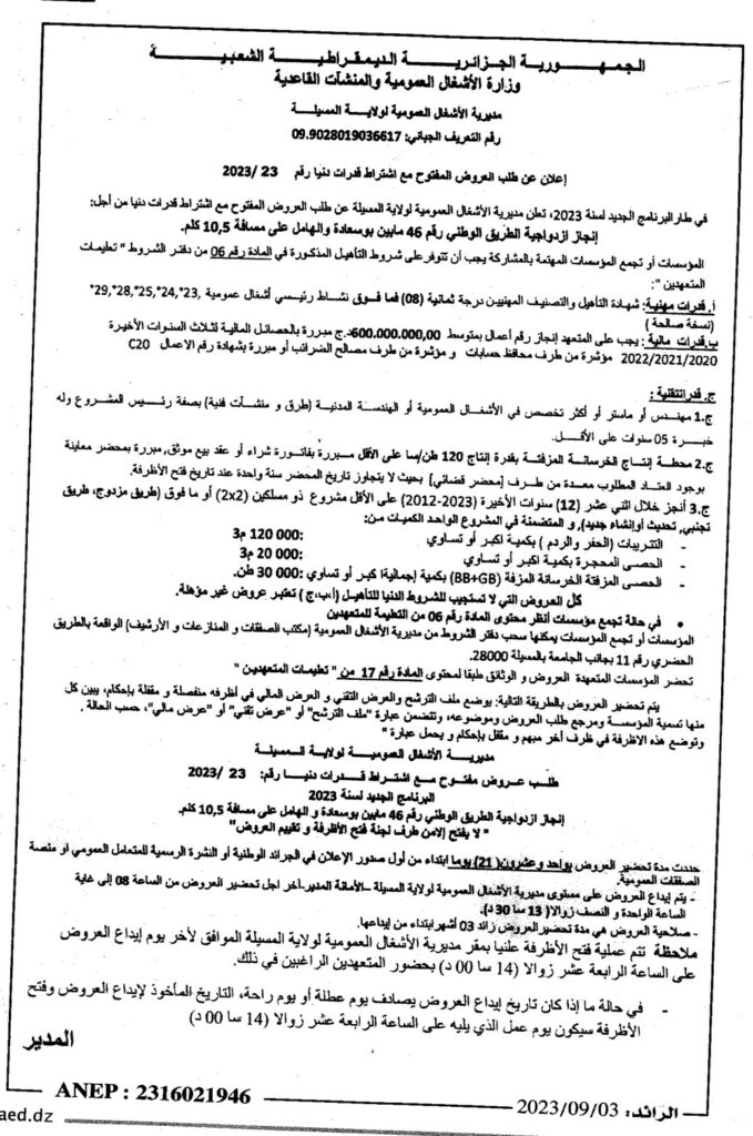 إعلان عن طلب العروض المفتوح 2023/23 مديرية الأشغال العمومية لولاية المسيلة