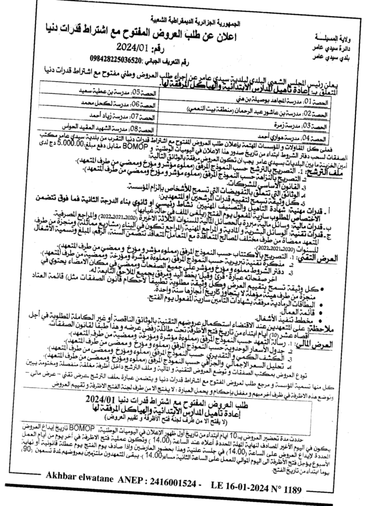 إعلان عن طلب العروض المفتوح 2024/01 بلدية سيدي عامر