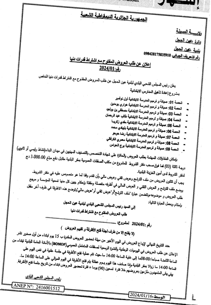 إعلان عن طلب العروض المفتوح 2024/01 بلدية عين الحجل