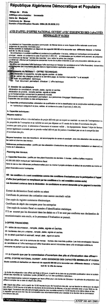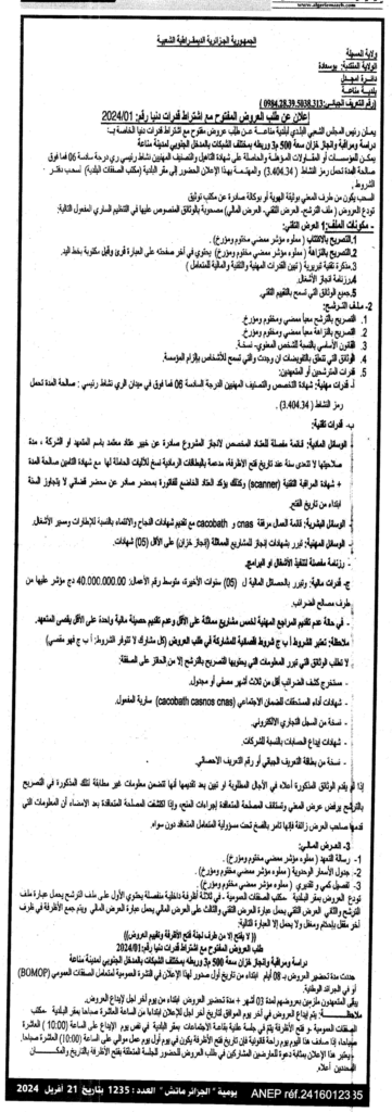 إعلان عن طلب العروض المفتوح 2024/01 بلدية مناعة