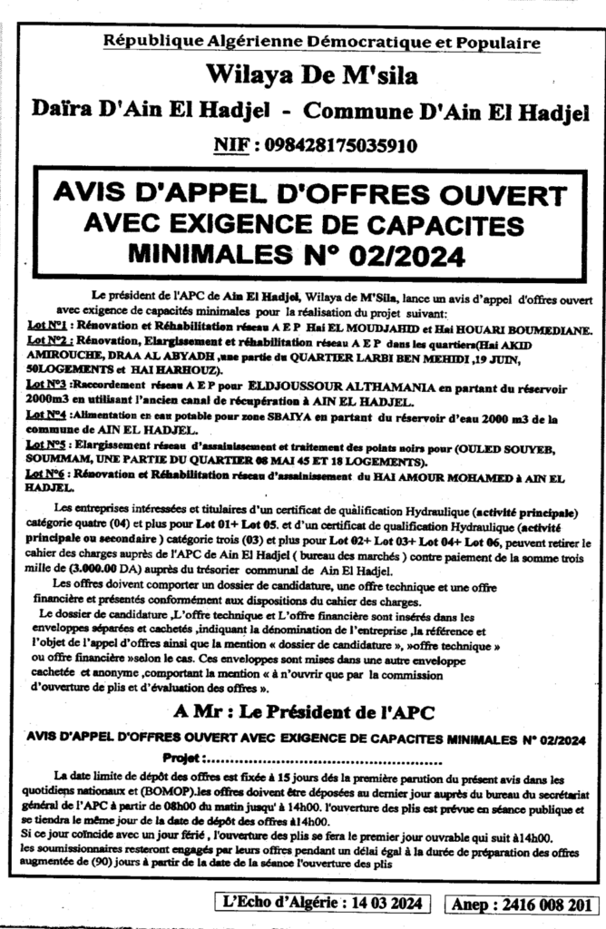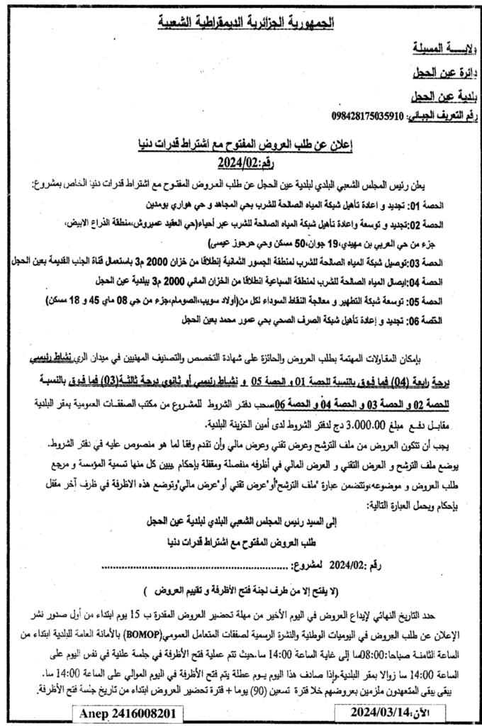 إعلان عن طلب العروض المفتوح 2024/02 بلدية عين الحجل