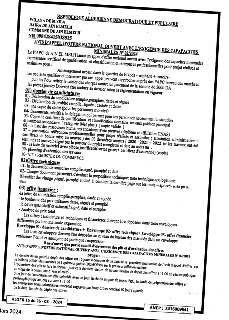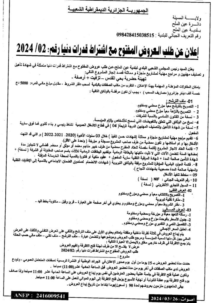 إعلان عن طلب العروض المفتوح 2024/02 بلدية عين الملح