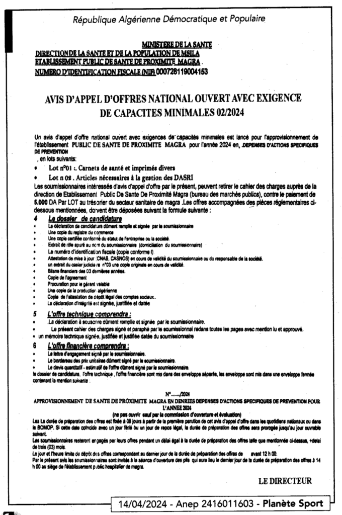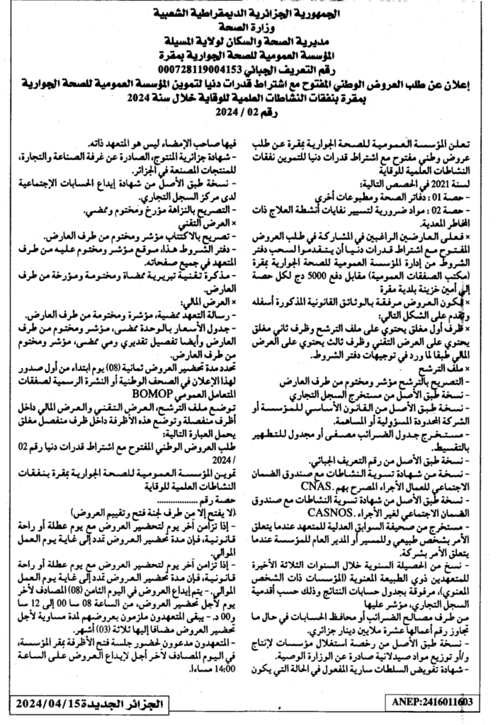 إعلان عن طلب العروض المفتوح 2024/02 لتموين المؤسسة العمومية للصحة الجوارية بمقرة بنفقات النشاطات العلمية الوقائية خلال سنة 2024