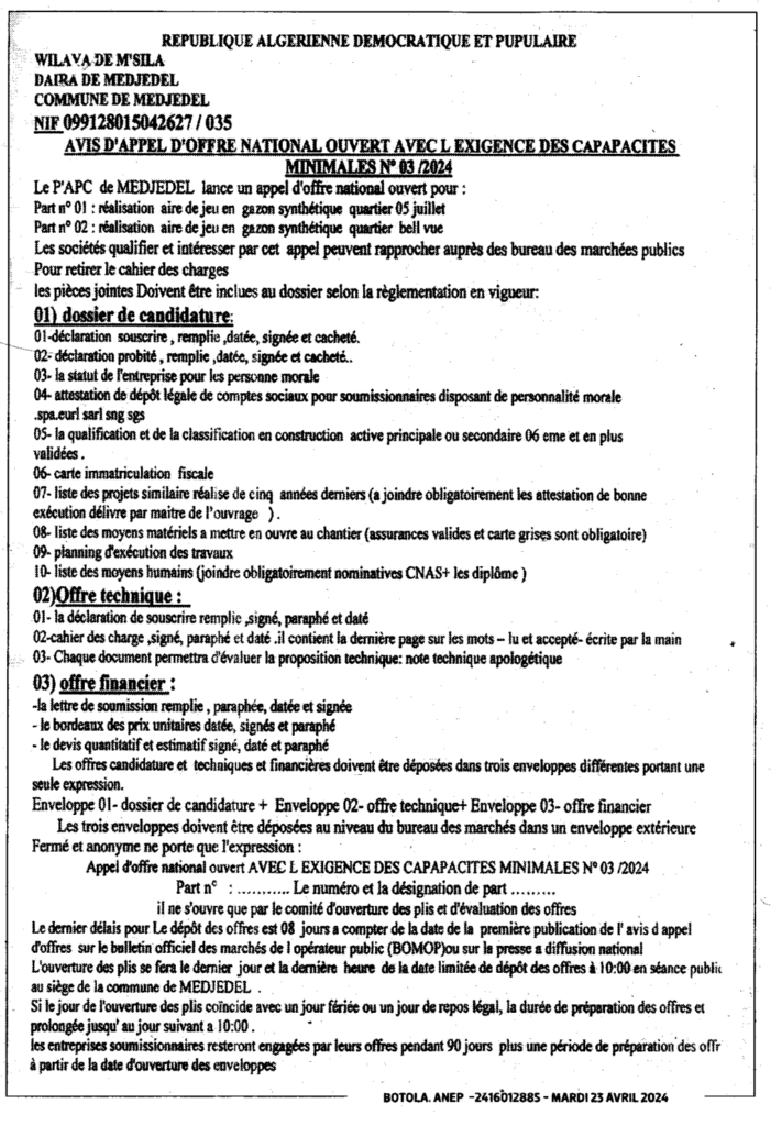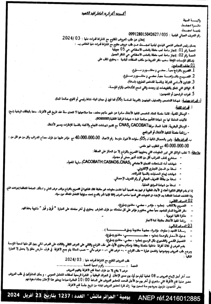 إعلان عن طلب العروض المفتوح 2024/03 بلدية امجدل