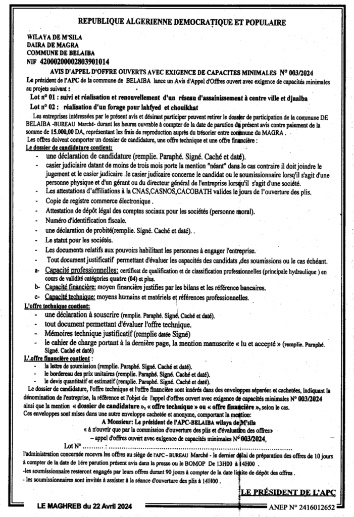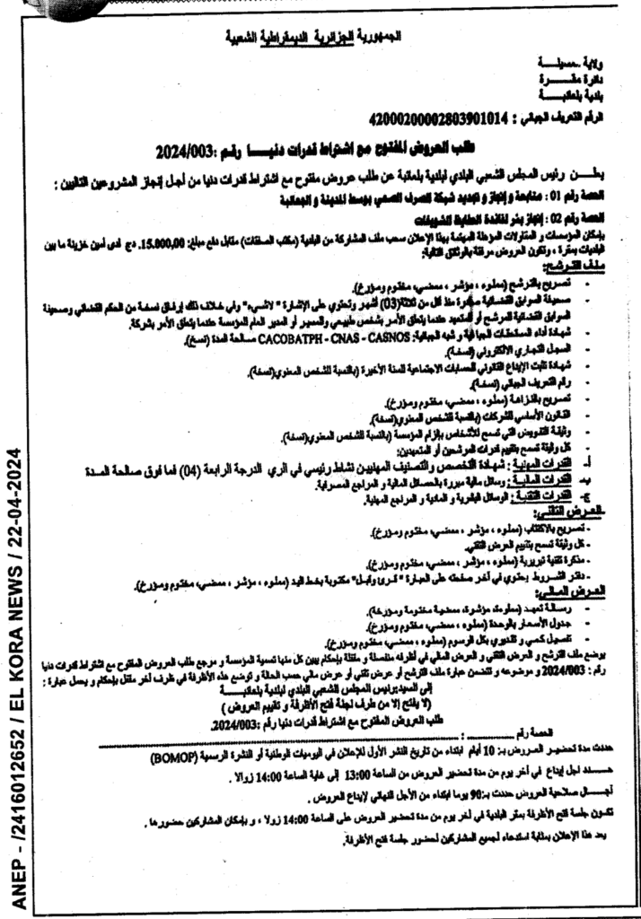 إعلان عن طلب العروض المفتوح 2024/03 بلدية بلعايبة