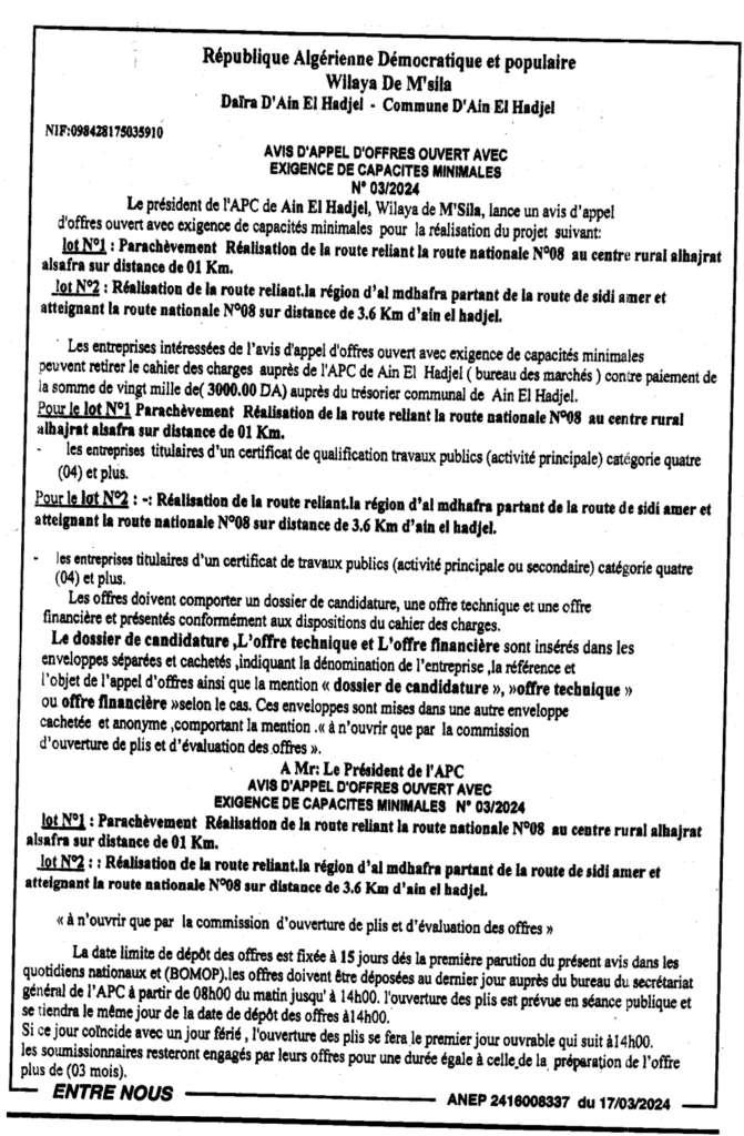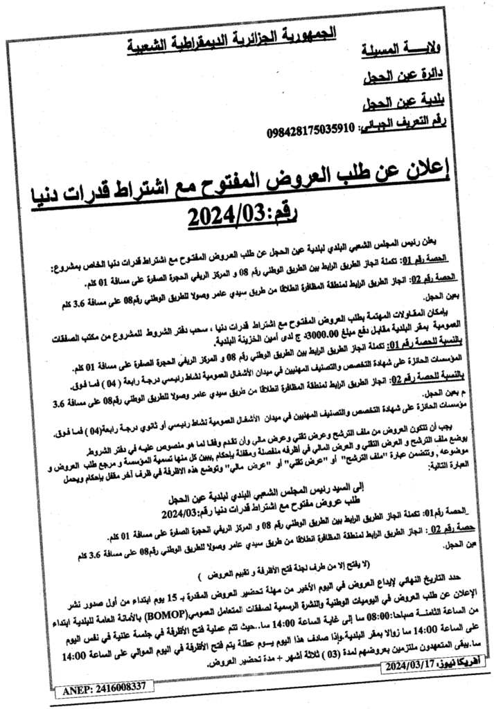 إعلان عن طلب العروض المفتوح 2024/03 بلدية عين الحجل