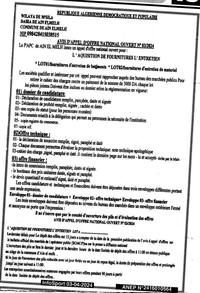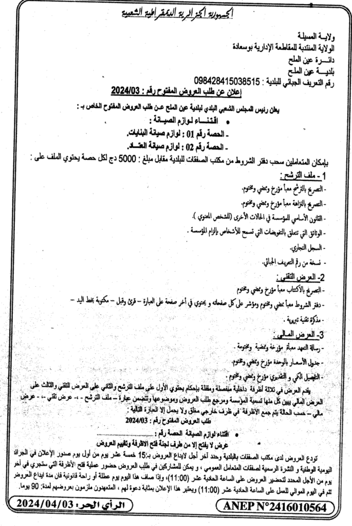 إعلان عن طلب العروض المفتوح 2024/03 بلدية عين الملح